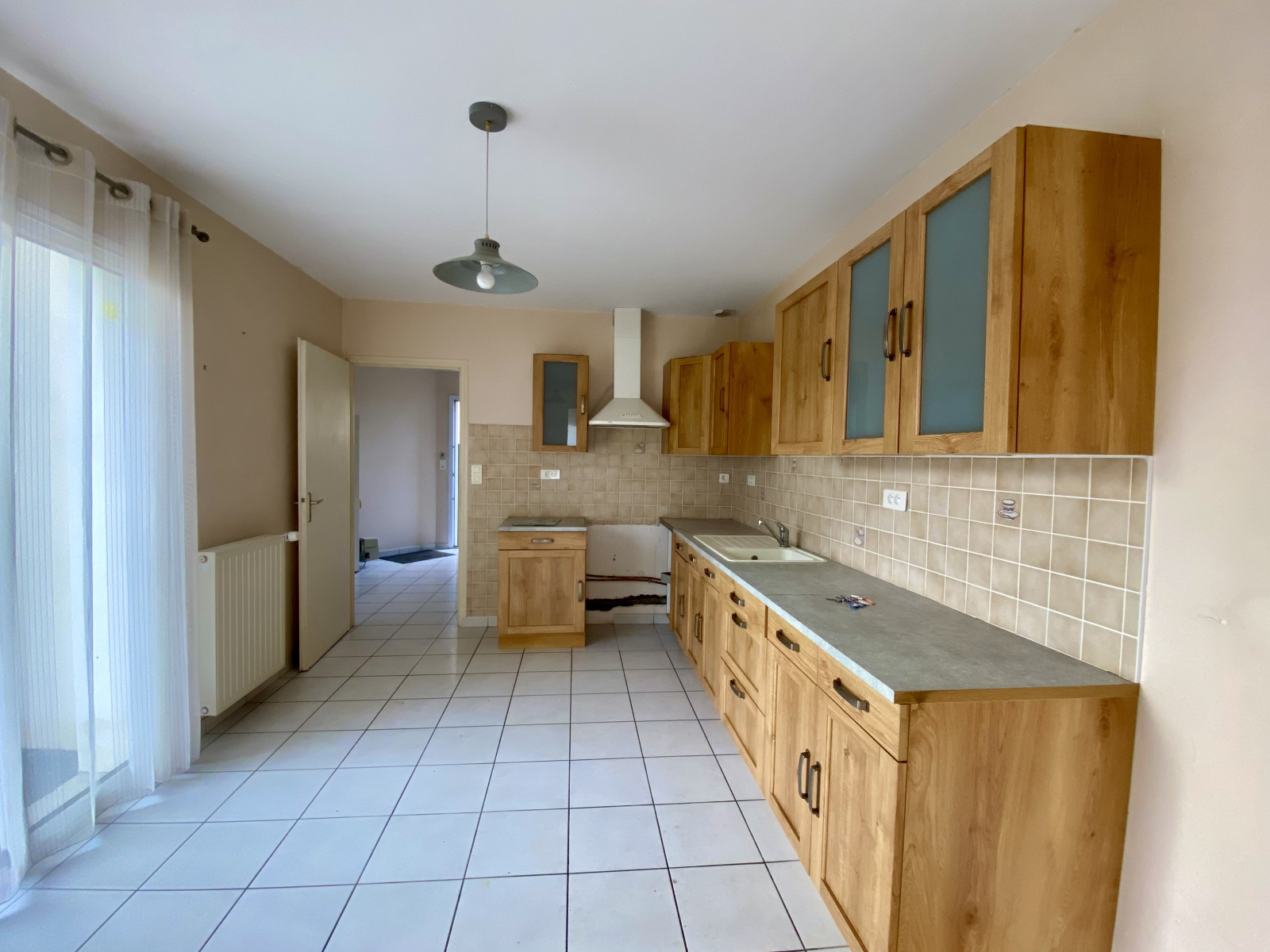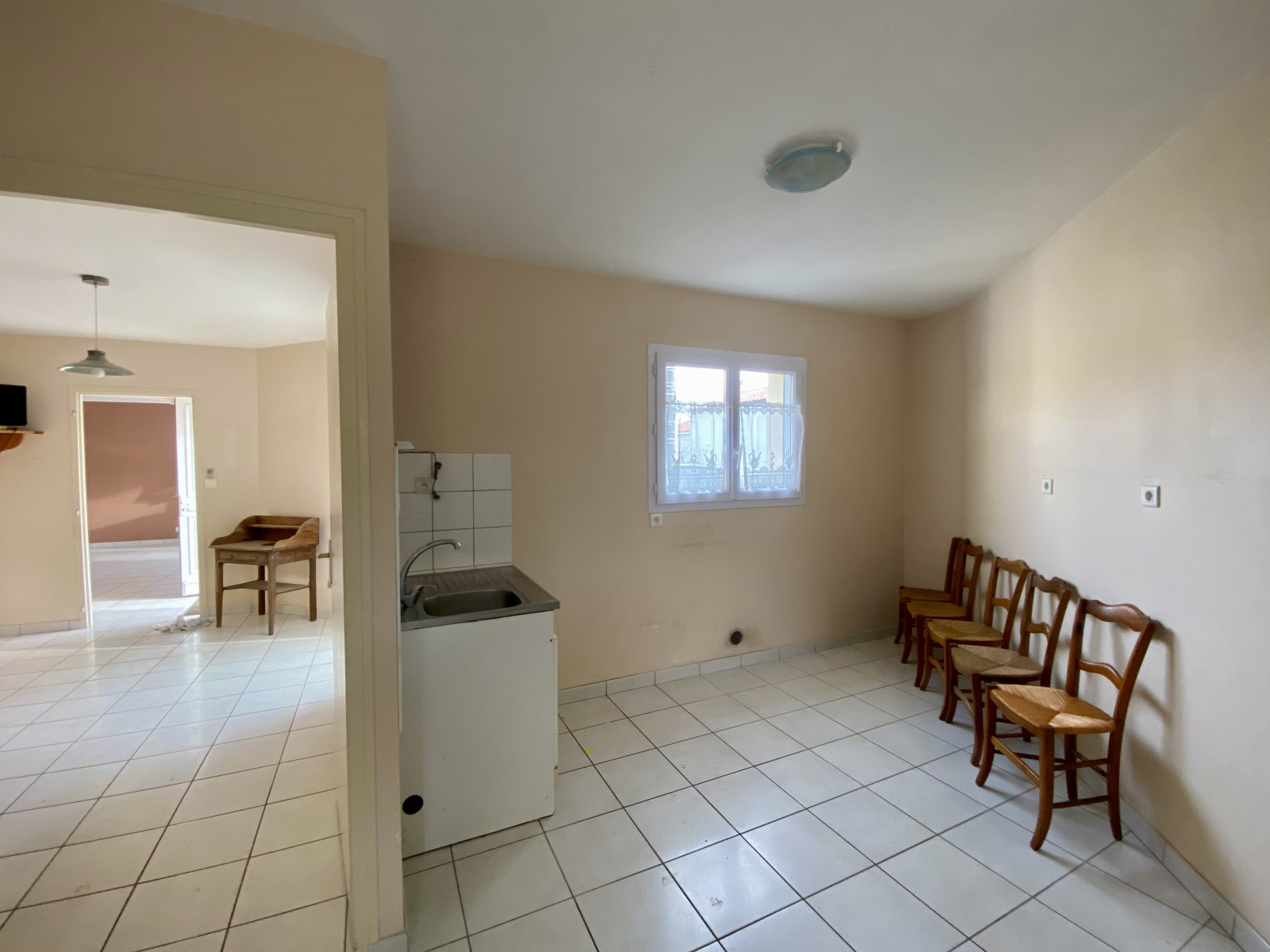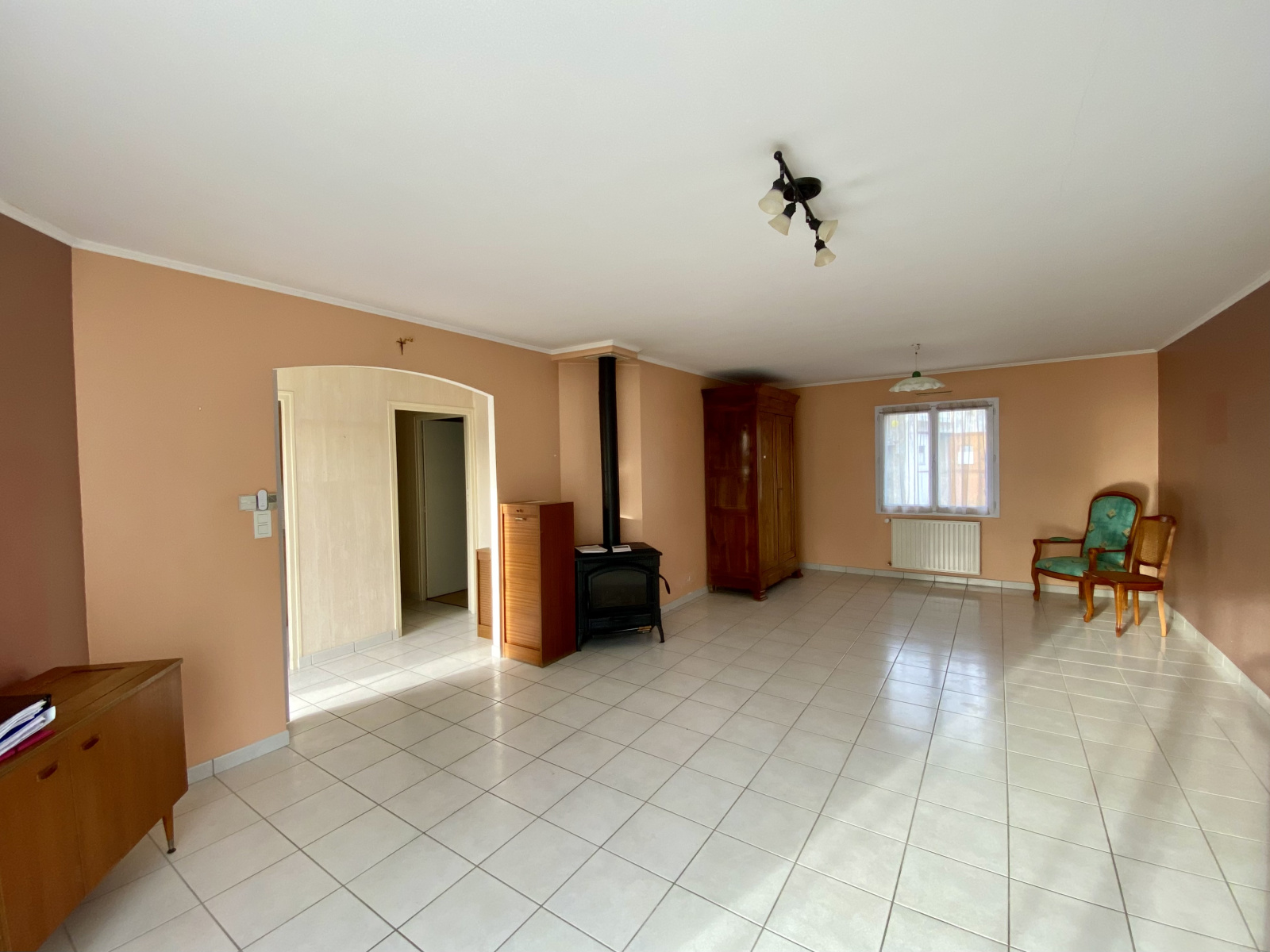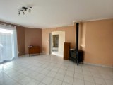 Un hall d'entrée, d'un côté une agréable pièce de vie très lumineuse de 35 m² avec un poêle à bois, de l'autre une cuisine avec ouverture directe sur l'extérieur. Dans le prolongement, vous aurez accès à la buanderie, puis au garage et au jardin.